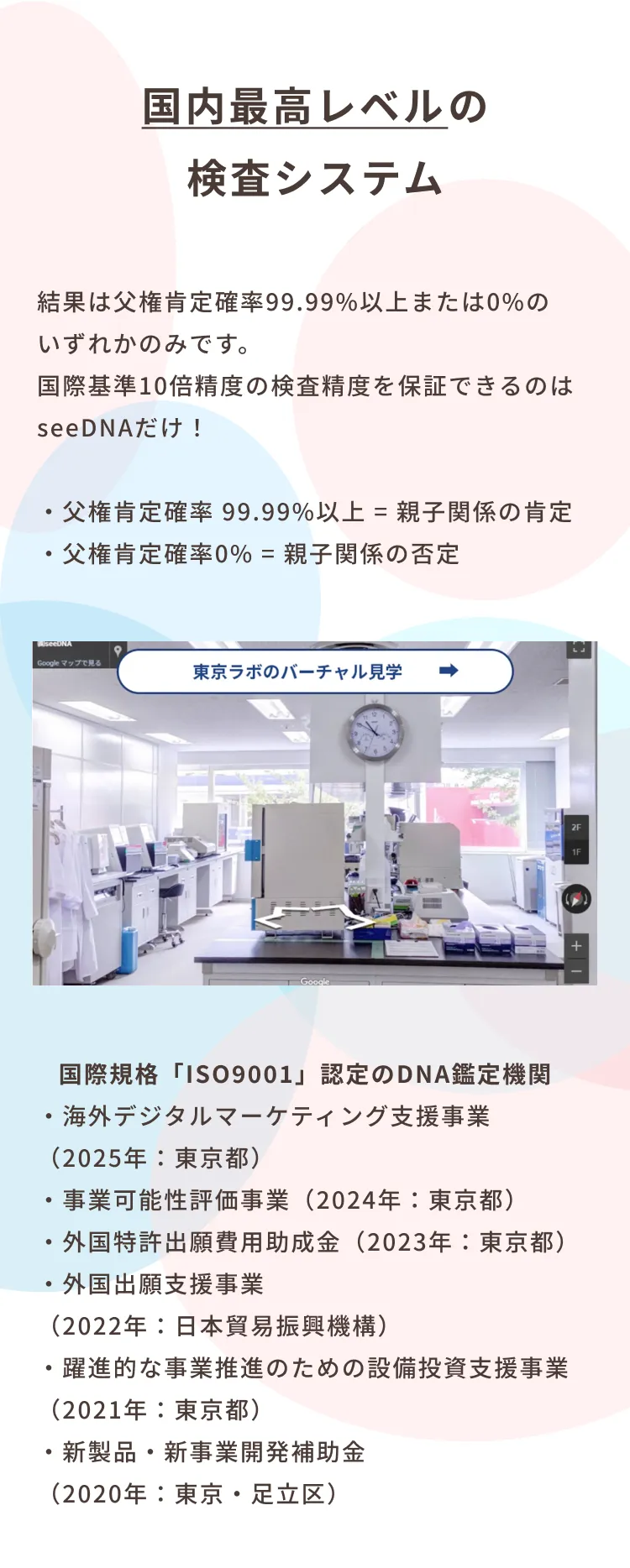 ※5:国内で唯一、 血縁関係を認めるために必要な父権肯定確率の最低保証精度を公開しているのはseeDNA遺伝医療研究所だけ! 最低保証精度は国際基準の約10倍!