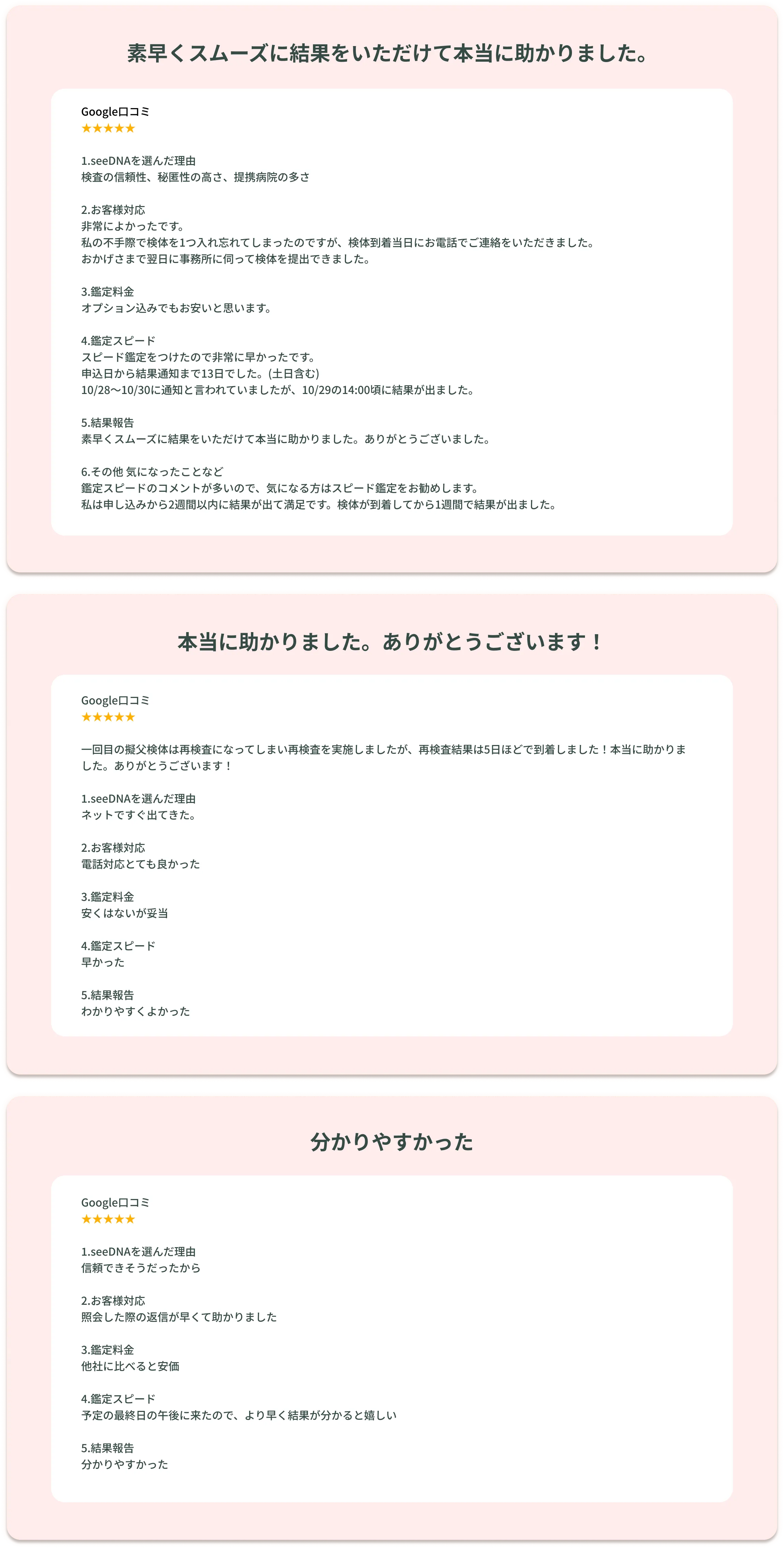 解析データと検体の写真を掲載した分かりやすい結果報告書が最短3日でご確認いただけます。