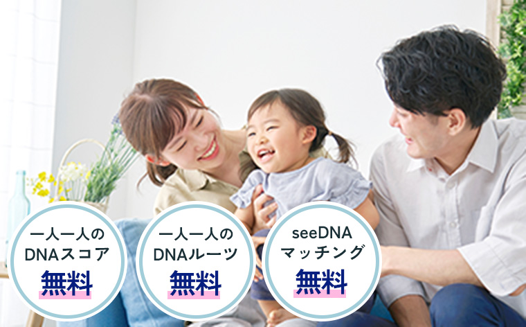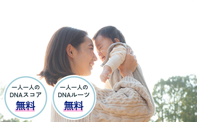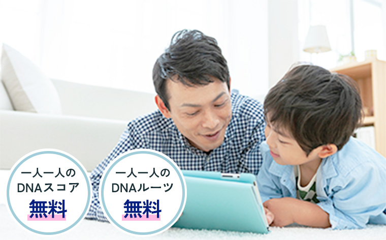 検査に参加した親と子のDNAに刻まれた遺伝的な傾向から、自分のDNAの優れているところや、今後の生活で注意すべきポイントを把握することができる遺伝子検査です。 さらには、自分のDNAスコアが日本人の中で上位何パーセントに位置するのか※1の数値を無料※2で確認できます。